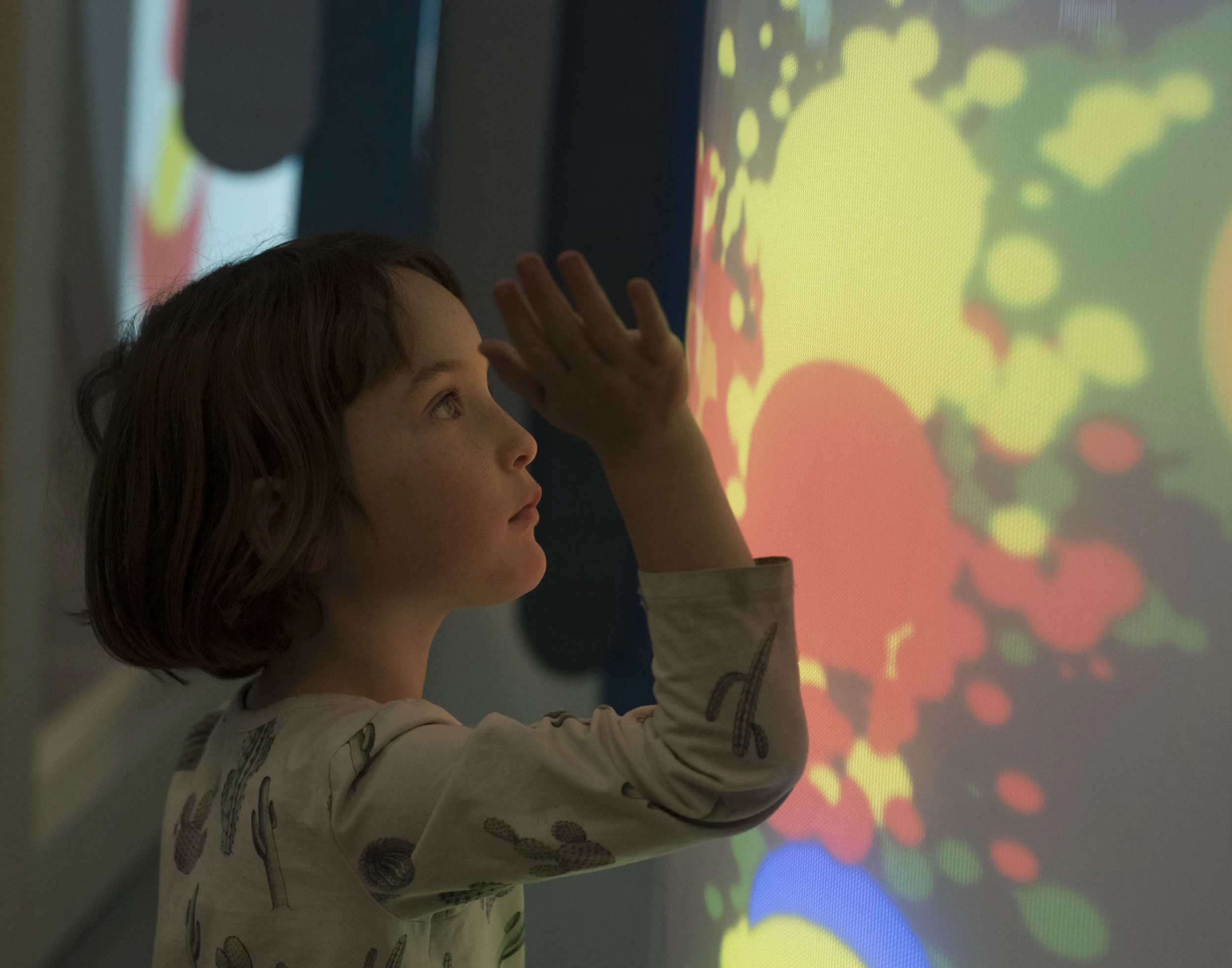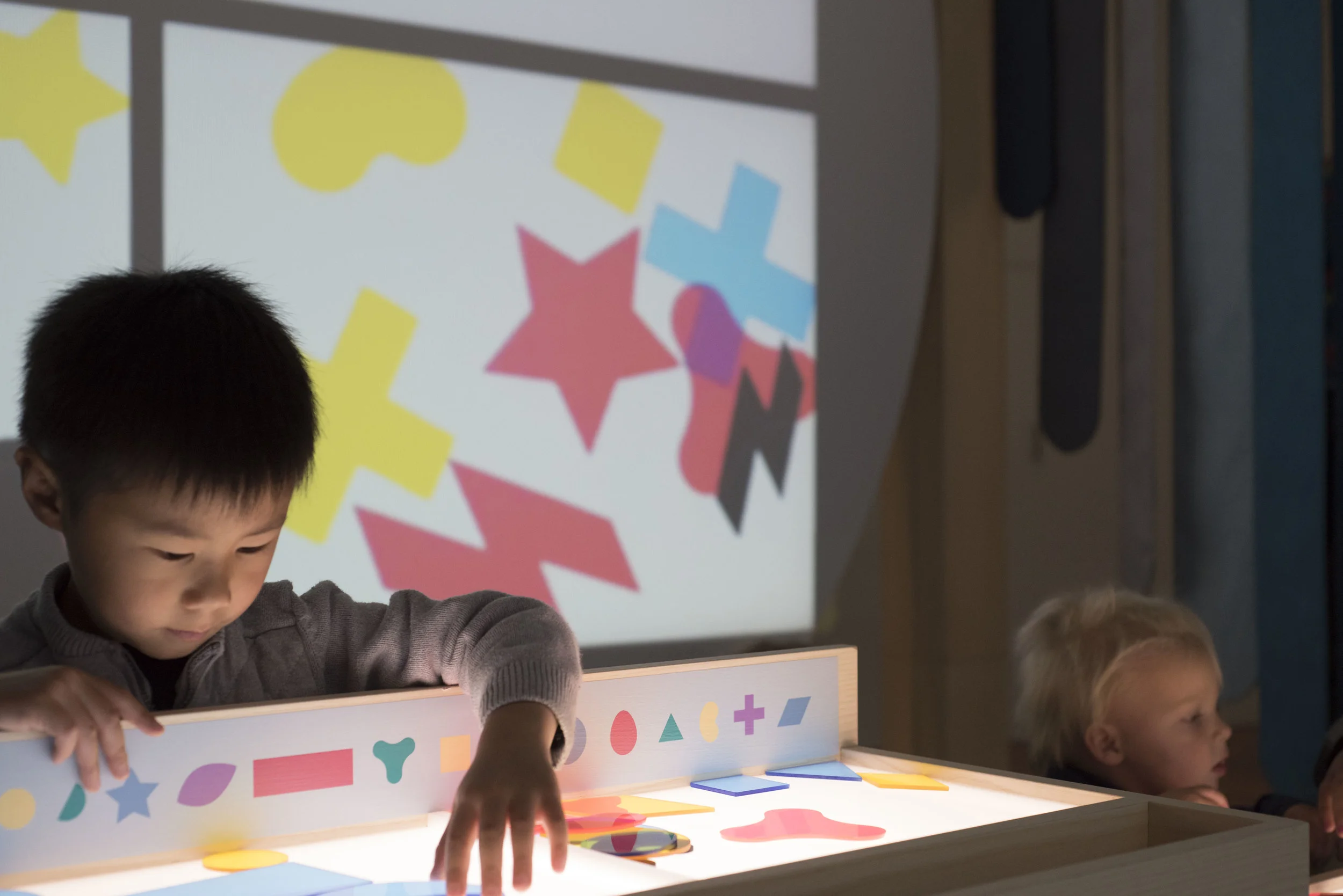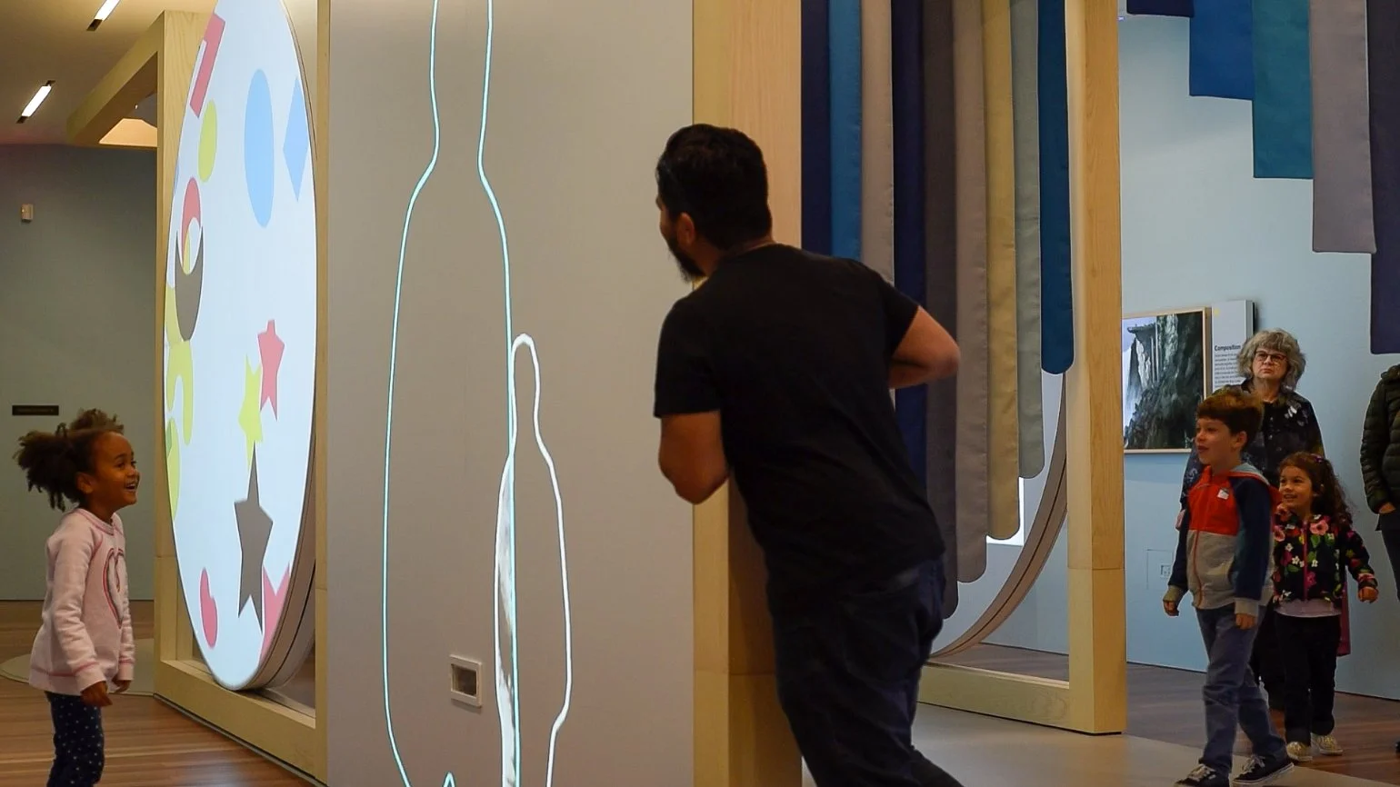 In the shape-and-form activity, children work together on both sides of a shared wall to discover the many kinds of shapes that can be made with the human body. Through depth-perception cameras, movement is captured on a double-activated surface to create intersecting silhouettes that, when overlapped, reveal details from recognizable paintings and prints from the FAMSF collections.
