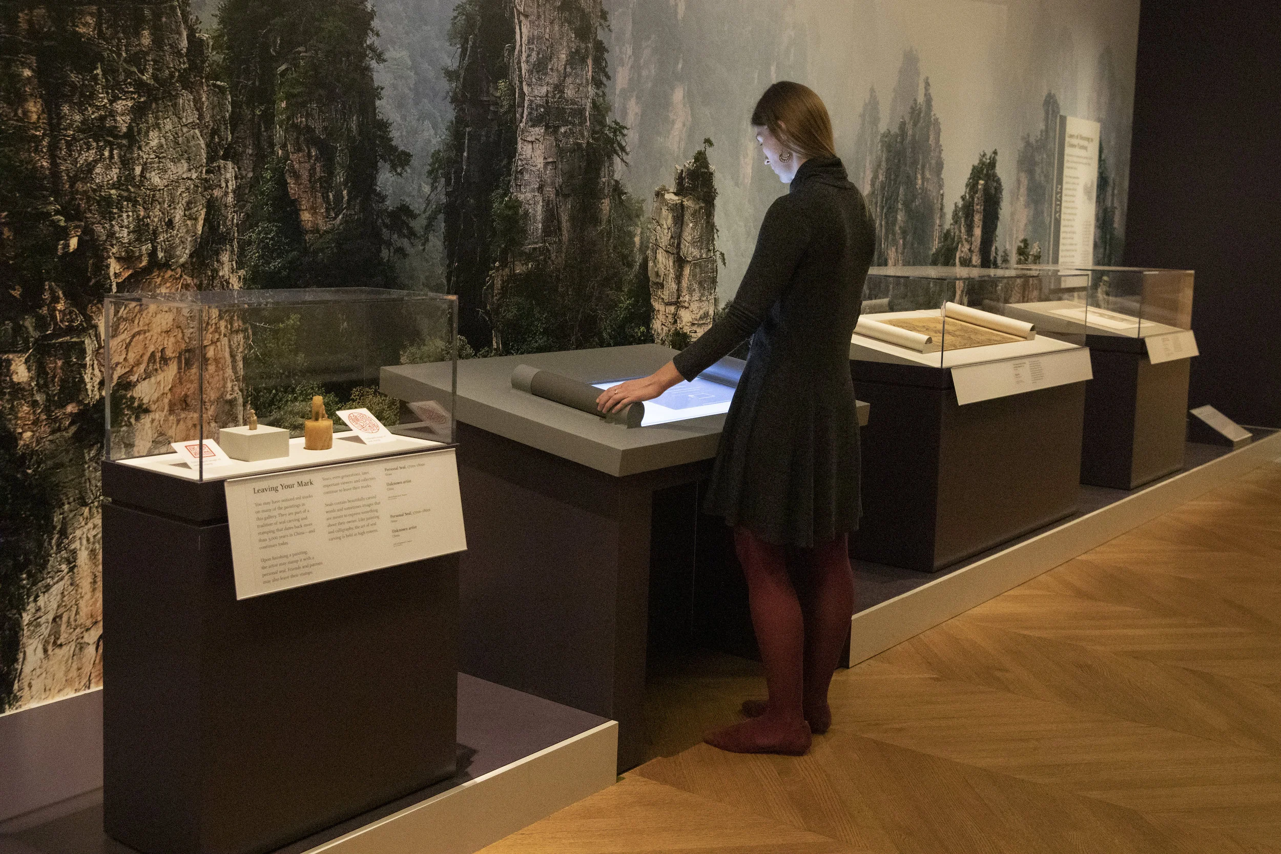 In the Chinese gallery, an interactive scroll allows visitors to move through and learn more about Wang Wen’s painting from the DIA collection, View from the Keyin Pavilion on Paradise (Baojie) Mountain. Chinese paintings were records of dynamic and ongoing exchanges between generations of artists and viewers. The physical act of moving the scroll wheel and leaving a personal seal at the end of their viewing experience provides visitors with a tangible and personal interaction with the artwork and its traditional method of viewing.